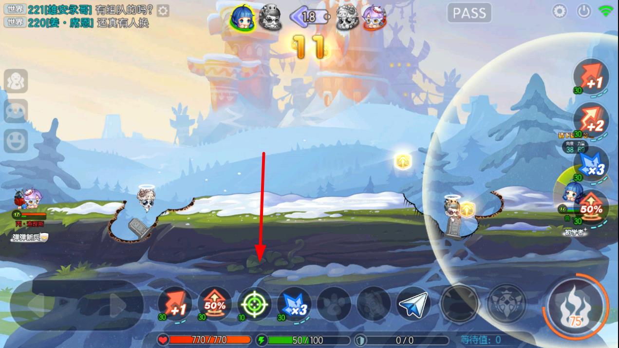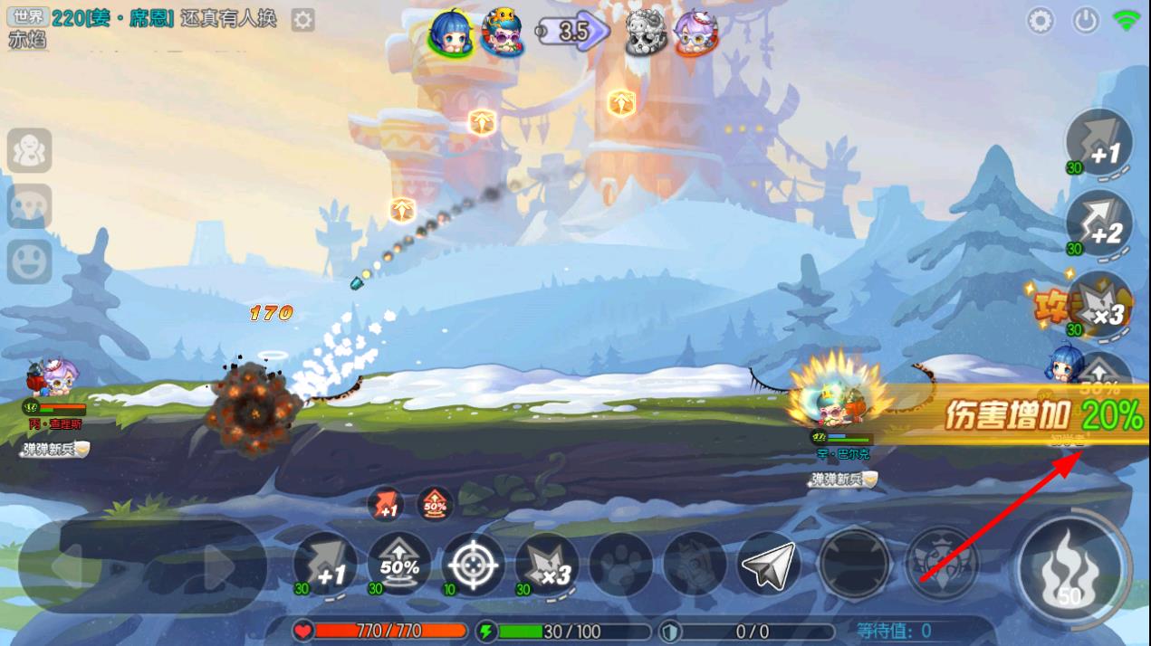 3、點(diǎn)擊屏幕下方的增益?zhèn)D標(biāo)增加攻擊力,點(diǎn)擊發(fā)射按鈕,即可增加傷害,此時(shí)發(fā)射炮彈能打出更高的傷害。