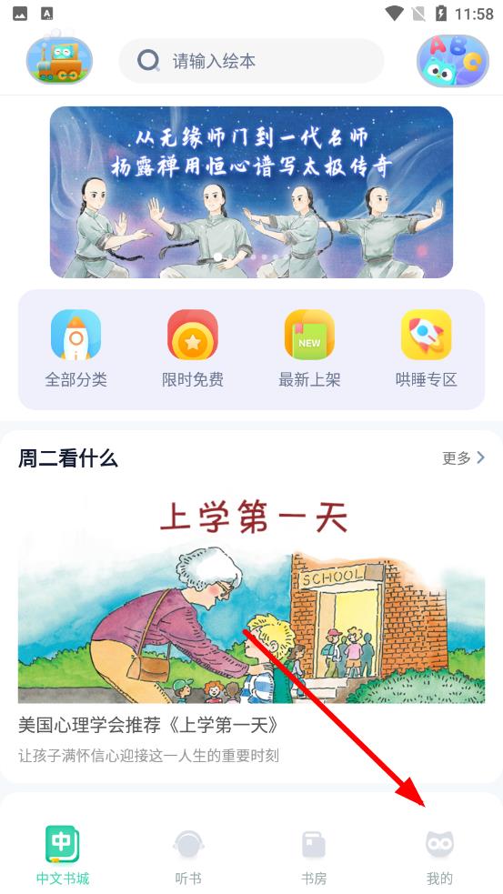 1、打開咿啦看書繪本故事app進(jìn)入首頁后,點(diǎn)擊屏幕底部導(dǎo)航欄最右側(cè)我的圖標(biāo)進(jìn)入個(gè)人中心。