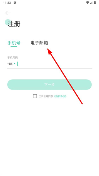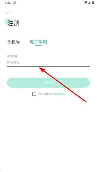 3、在頁面輸入郵箱地址,勾選同意隱私協(xié)議后,點(diǎn)擊下一步,按提示完成后續(xù)操作即可注冊。