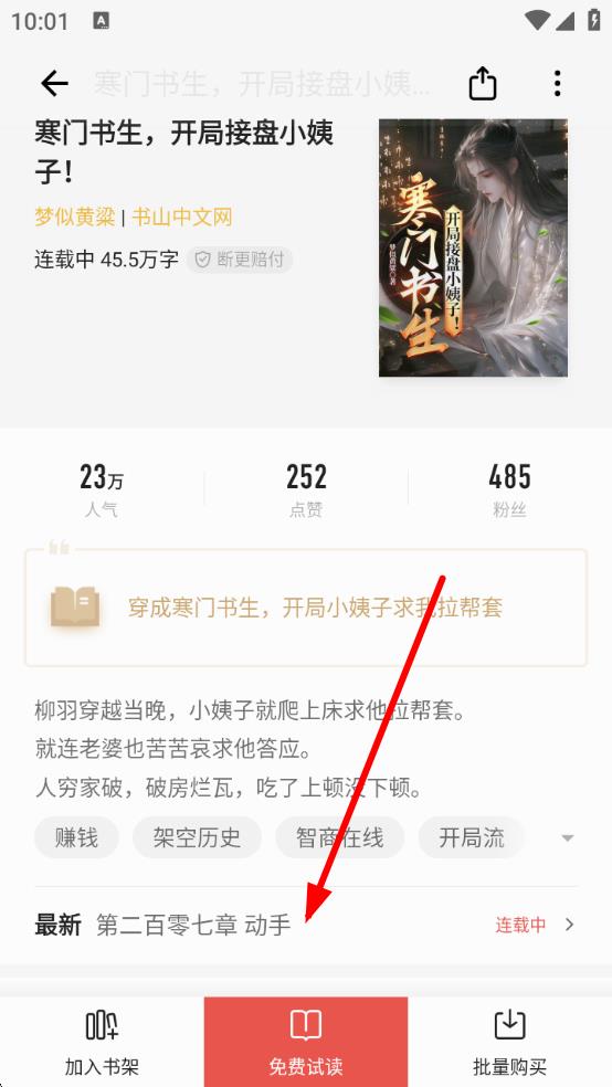 1、進入掌閱,在小說詳情頁點擊免費試讀進入閱讀界面。
