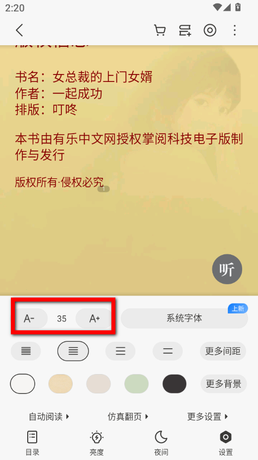 4、在設(shè)置界面中,找到A-和A+按鈕,點擊它們即可減小或增大字體大小。