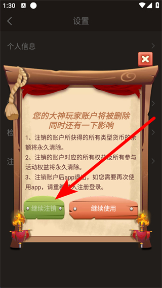 4、我們需建議點擊繼續(xù)注銷,完成大神玩家賬號注銷操作。