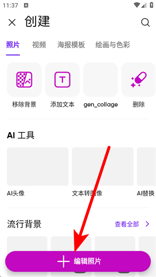 1.打開PicsArt應(yīng)用,點(diǎn)擊編輯照片按鈕,選擇需要摳圖的照片。