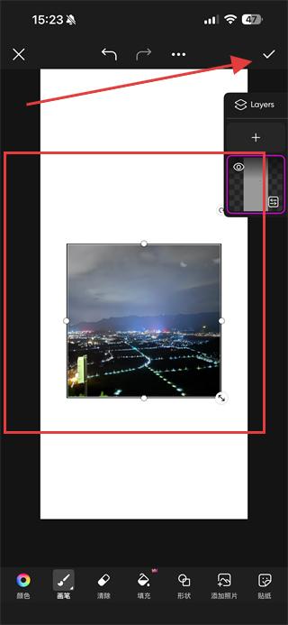 4、照片添加后,可調(diào)整圖片,調(diào)整完成后點(diǎn)擊右上角對勾,完成PicsArt添加照片的操作。