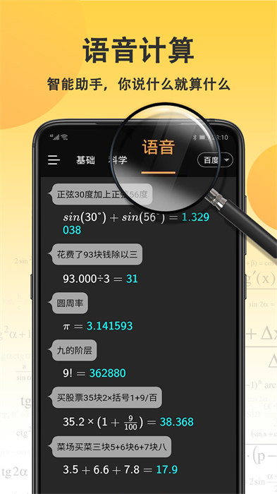 通過(guò)語(yǔ)音即可輸入算式進(jìn)行計(jì)算,體驗(yàn)意想不到的方便快捷。