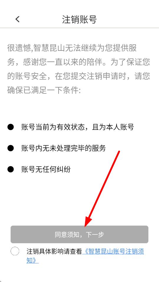 4、在注銷賬號(hào)頁面,仔細(xì)閱讀相關(guān)條件,勾選同意相關(guān)須知后,點(diǎn)擊同意須知,下一步,然后按照提示完成后續(xù)操作即可注銷賬號(hào)。