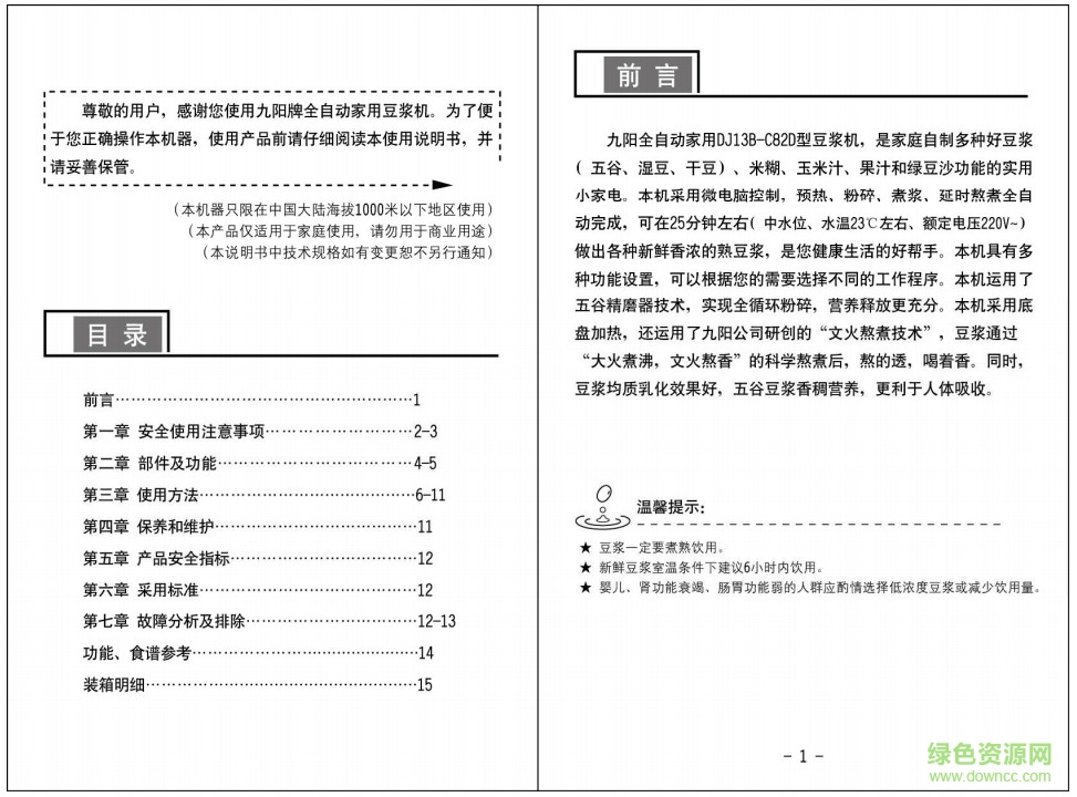 1.在綠色資源網(wǎng)下載九陽豆?jié){機(jī)使用說明書pdf