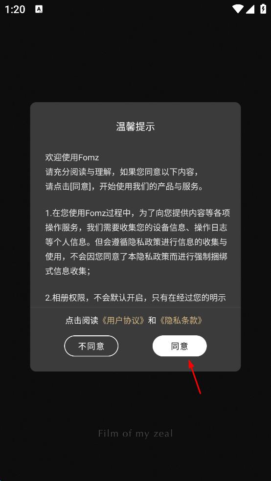 1、打開Fomz app,在彈出的溫馨提示界面,找到“同意”按鈕,點(diǎn)擊該按鈕。