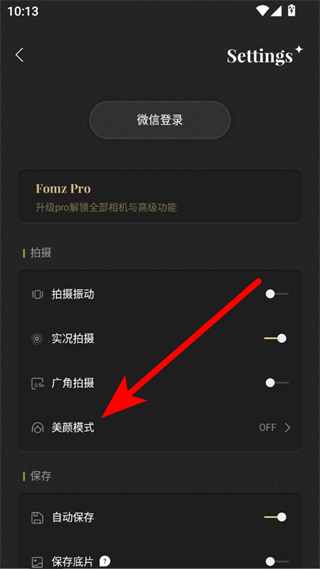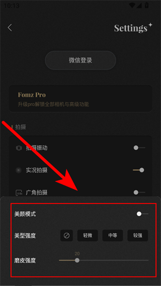 3、在設(shè)置頁(yè)面點(diǎn)擊美顏模式,可對(duì)美顏類型強(qiáng)度、磨皮強(qiáng)度等進(jìn)行調(diào)整。