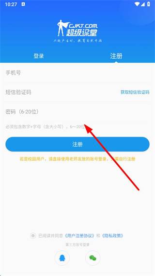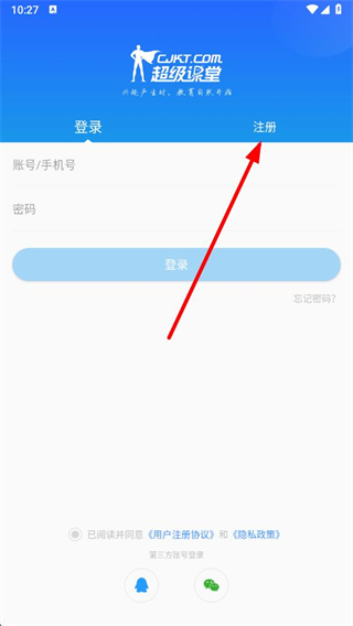 1、在超級課堂app啟動頁面,點擊登錄,進入登錄注冊頁面。