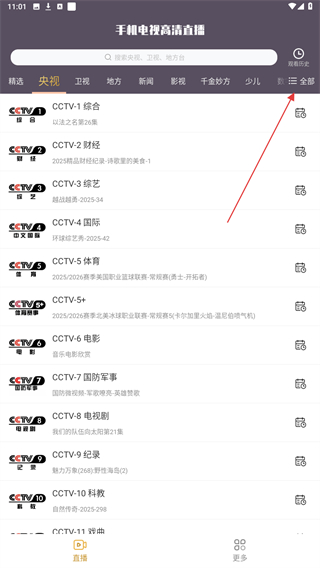 1、打開(kāi)手機(jī)電視高清直播的APP,進(jìn)入首頁(yè)點(diǎn)擊右上全部的按鈕。