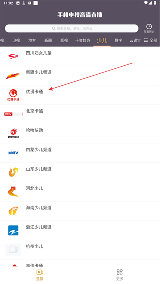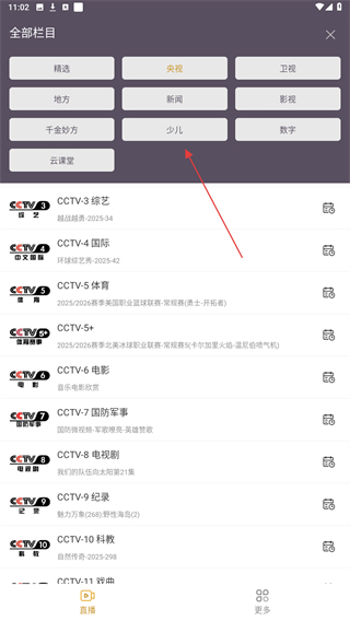 2、在上方彈出的全部欄目中,選擇并點(diǎn)擊少兒頻道的按鈕。