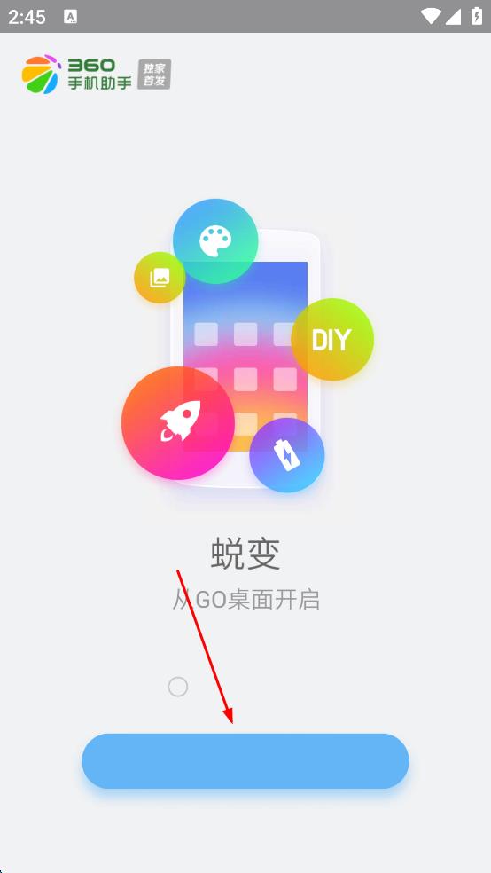 2、在“蛻變 從GO桌面開(kāi)啟”界面,繼續(xù)點(diǎn)擊底部藍(lán)色按鈕,完成引導(dǎo)步驟,進(jìn)入桌面預(yù)覽階段。