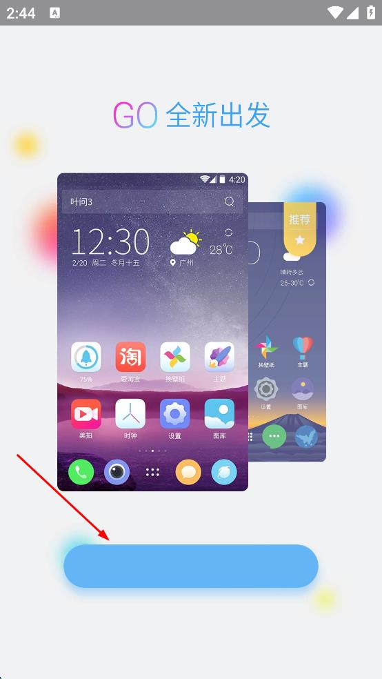 1、打開(kāi)GO桌面應(yīng)用,看到“GO 全新出發(fā)”界面,點(diǎn)擊底部藍(lán)色按鈕,進(jìn)入下一個(gè)引導(dǎo)頁(yè)面。