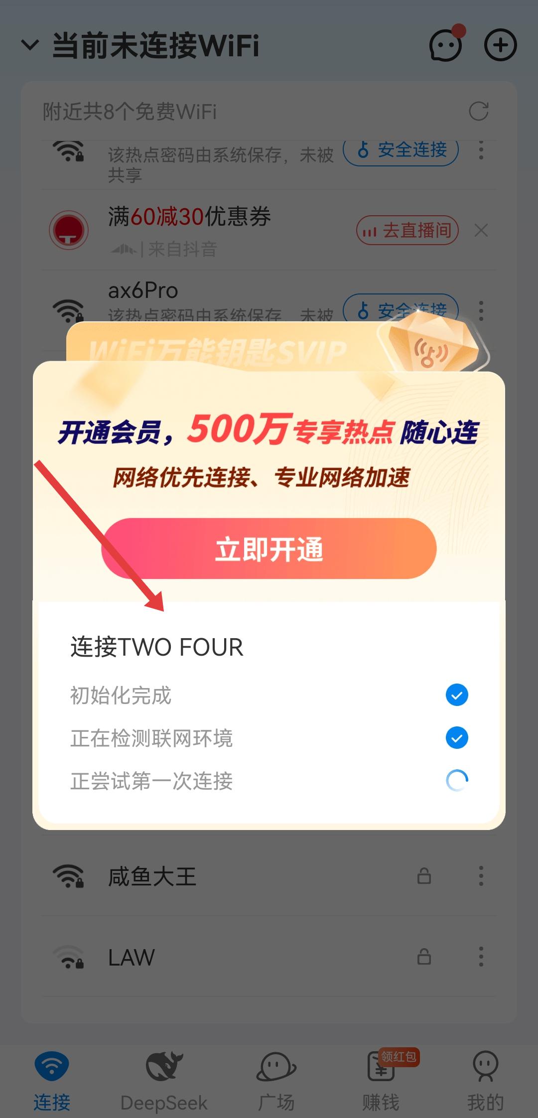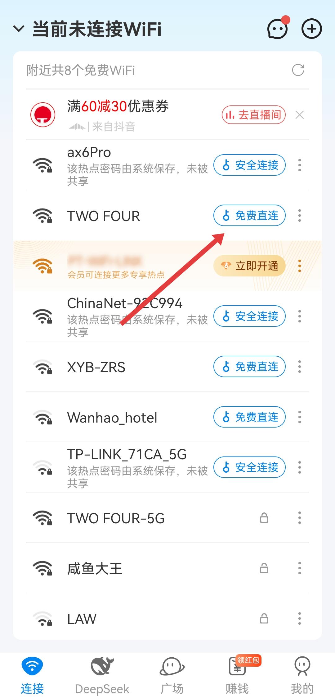 1、打開WiFi萬能鑰匙,在附近WiFi列表里,找到帶有免費直連按鈕的WiFi,點擊該按鈕啟動連接流程。