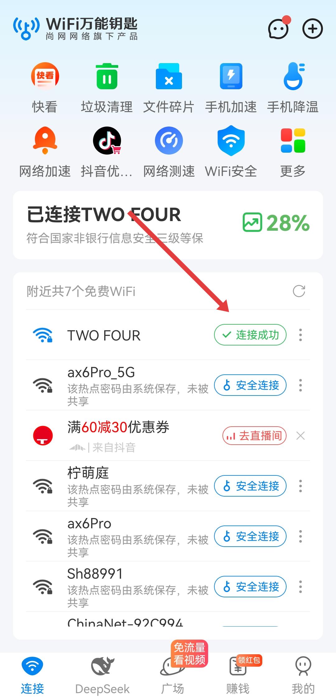 3、當(dāng)主界面對應(yīng)WiFi旁顯示連接成功時,說明已通過WiFi萬能鑰匙成功連接該網(wǎng)絡(luò),可正常使用網(wǎng)絡(luò)了。