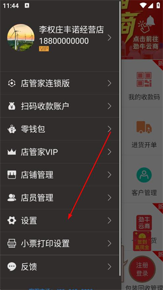 1、打開勁牛店管家APP,點擊左上角的店鋪頭像,展開側(cè)邊欄菜單。