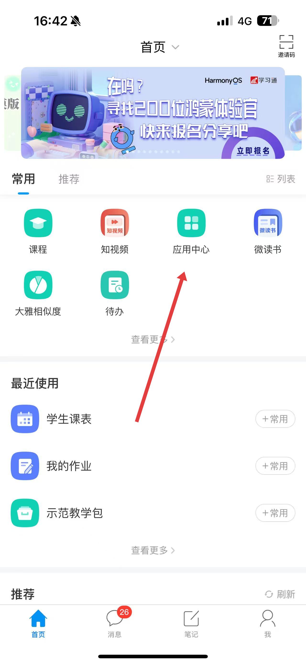 1、打開超星學(xué)習(xí)通App,在首頁點(diǎn)擊應(yīng)用中心進(jìn)入應(yīng)用列表。