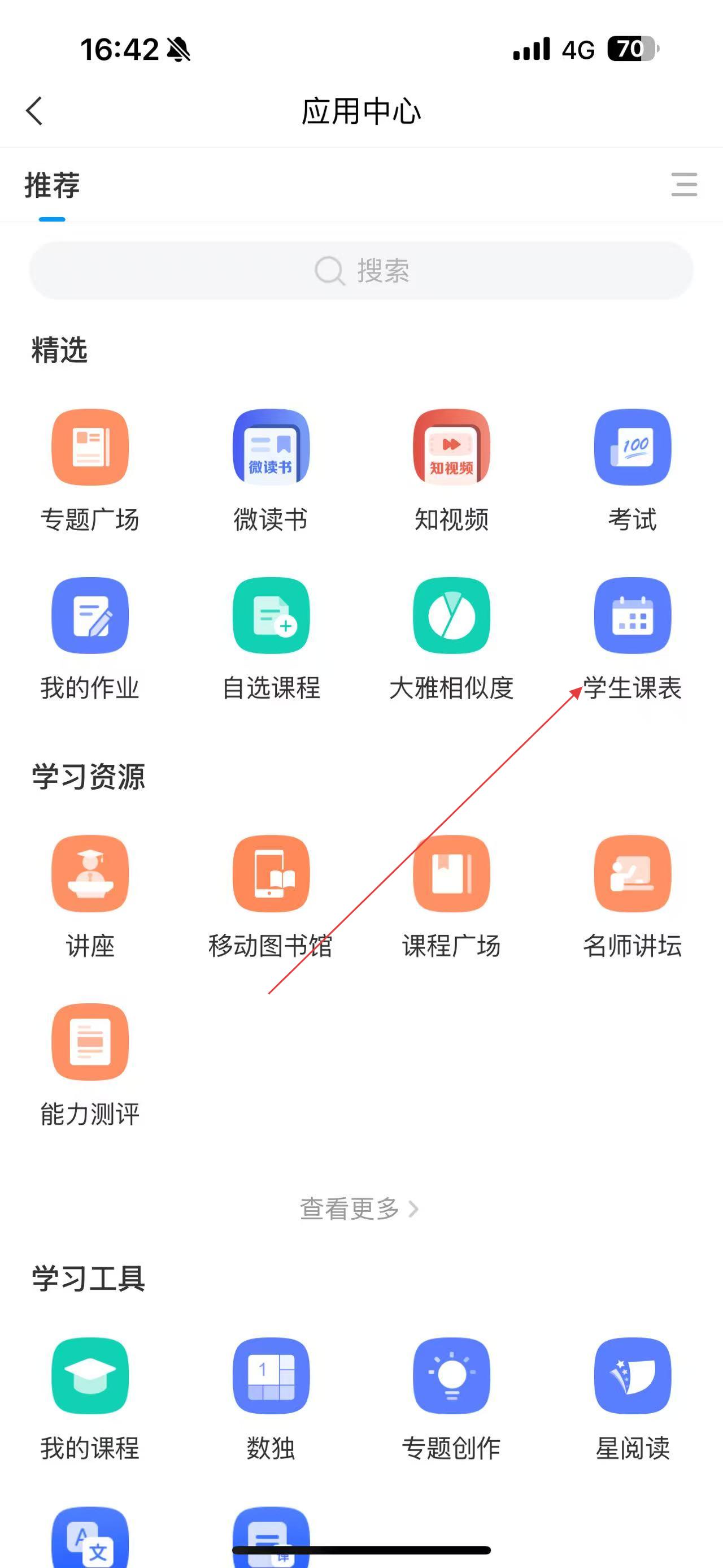 2、在應(yīng)用中心的精選分類里,找到并點(diǎn)擊學(xué)生課表選項(xiàng)。