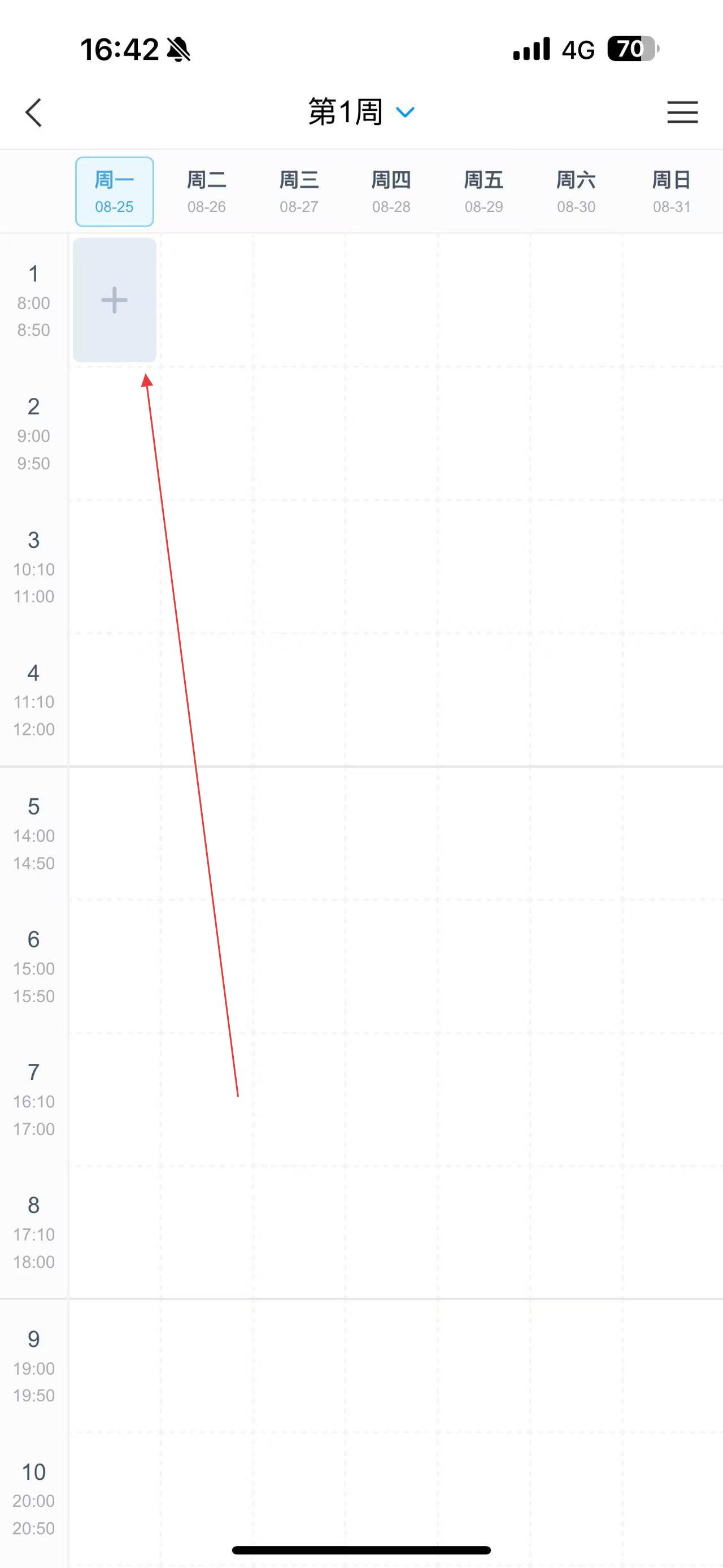 3、進(jìn)入課程表界面后,點(diǎn)擊課表中的加號(hào),按提示添加課程時(shí)間、名稱等信息來完善課表。