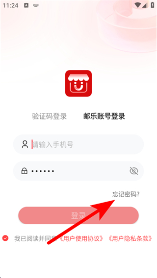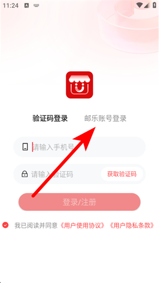 1、打開郵政郵助手APP,在登錄界面點擊郵樂賬號登錄。
