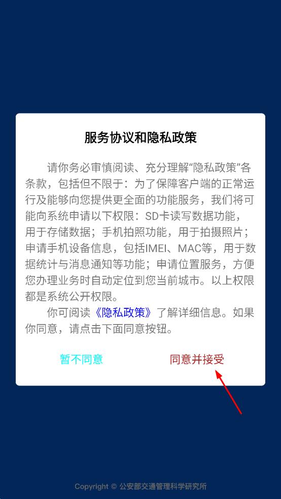1、打開交通管理類APP,在彈出的服務(wù)協(xié)議和隱私政策提示框中,點(diǎn)擊“同意并接受”按鈕。