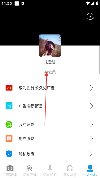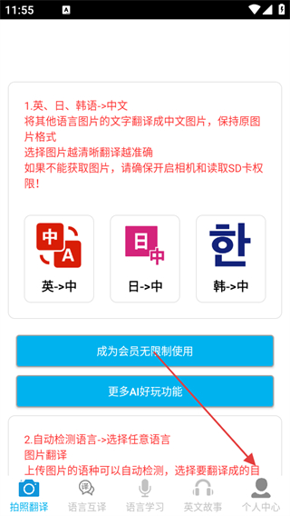 1、打開拍照翻譯APP,點擊底部導航欄中的個人中心選項。
