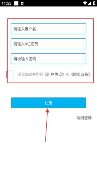 4、輸入用戶名、密碼,再次輸入密碼,勾選用戶協(xié)議和隱私政策,點擊注冊。