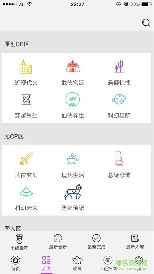 4.分類區(qū):分成CP區(qū),無CP區(qū),同人區(qū)三個大區(qū),也可看到編輯推薦,最新完結(jié),最新入站,最新更新的文