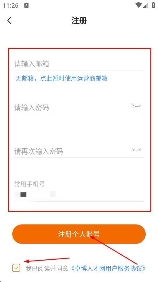 5、在注冊頁面,輸入郵箱、設(shè)置密碼,再次確認(rèn)密碼,勾選我已閱讀并同意卓博人才網(wǎng)用戶服務(wù)協(xié)議,點(diǎn)擊注冊個(gè)人賬號(hào),完成注冊。
