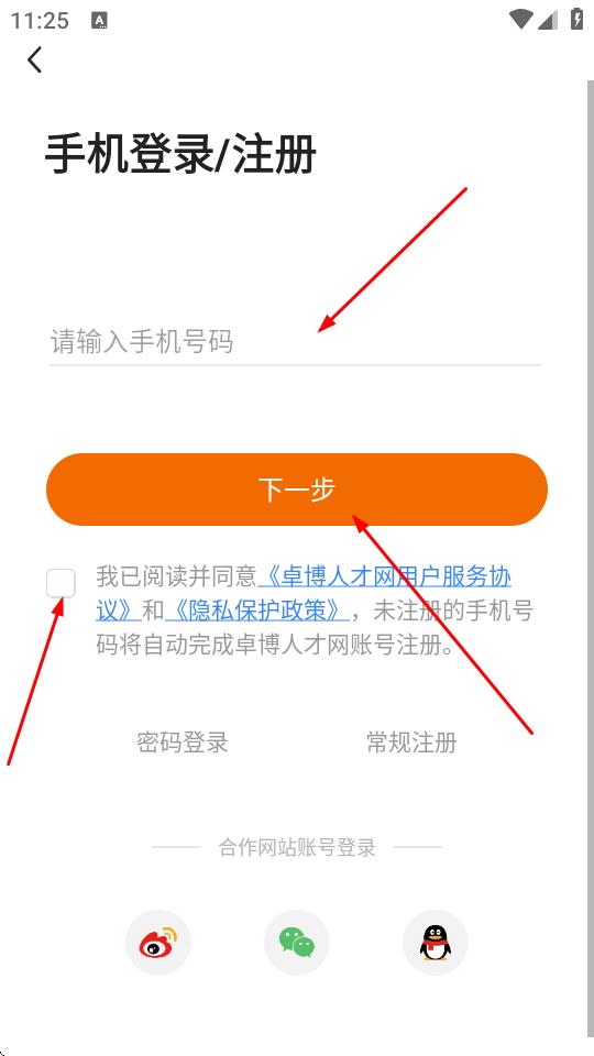 3、輸入手機(jī)號(hào)碼,勾選我已閱讀并同意卓博人才網(wǎng)用戶服務(wù)協(xié)議和隱私保護(hù)政策,點(diǎn)擊下一步。