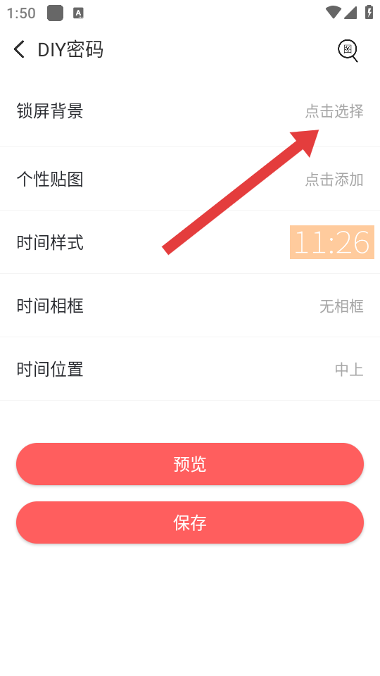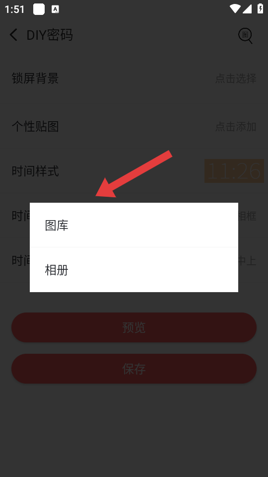 3、在DIY密碼設(shè)置界面,點擊鎖屏背景點擊選擇按鈕,觸發(fā)圖片來源選擇彈窗。
