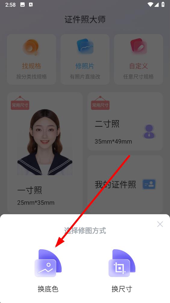 2、點擊換底色選項,在相冊選擇需要更換底色的證件照,進入更換底色操作。