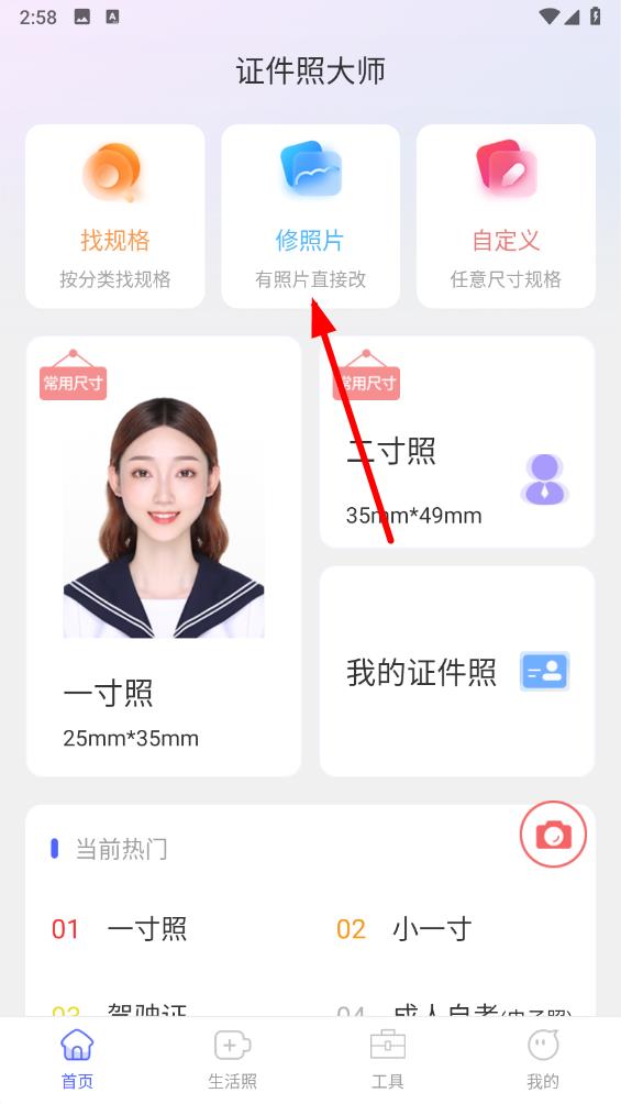 1、打開證件照大師APP,在首頁點擊修照片選項,進入照片選擇界面。