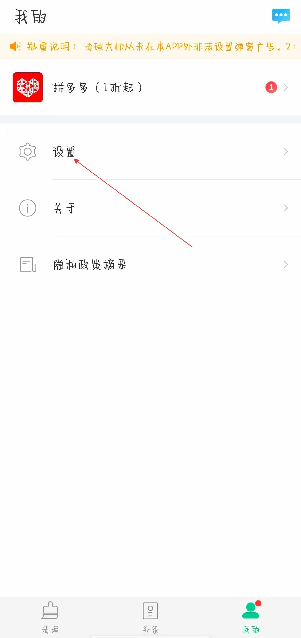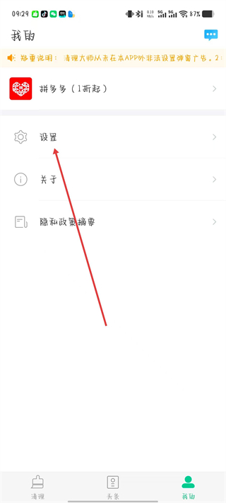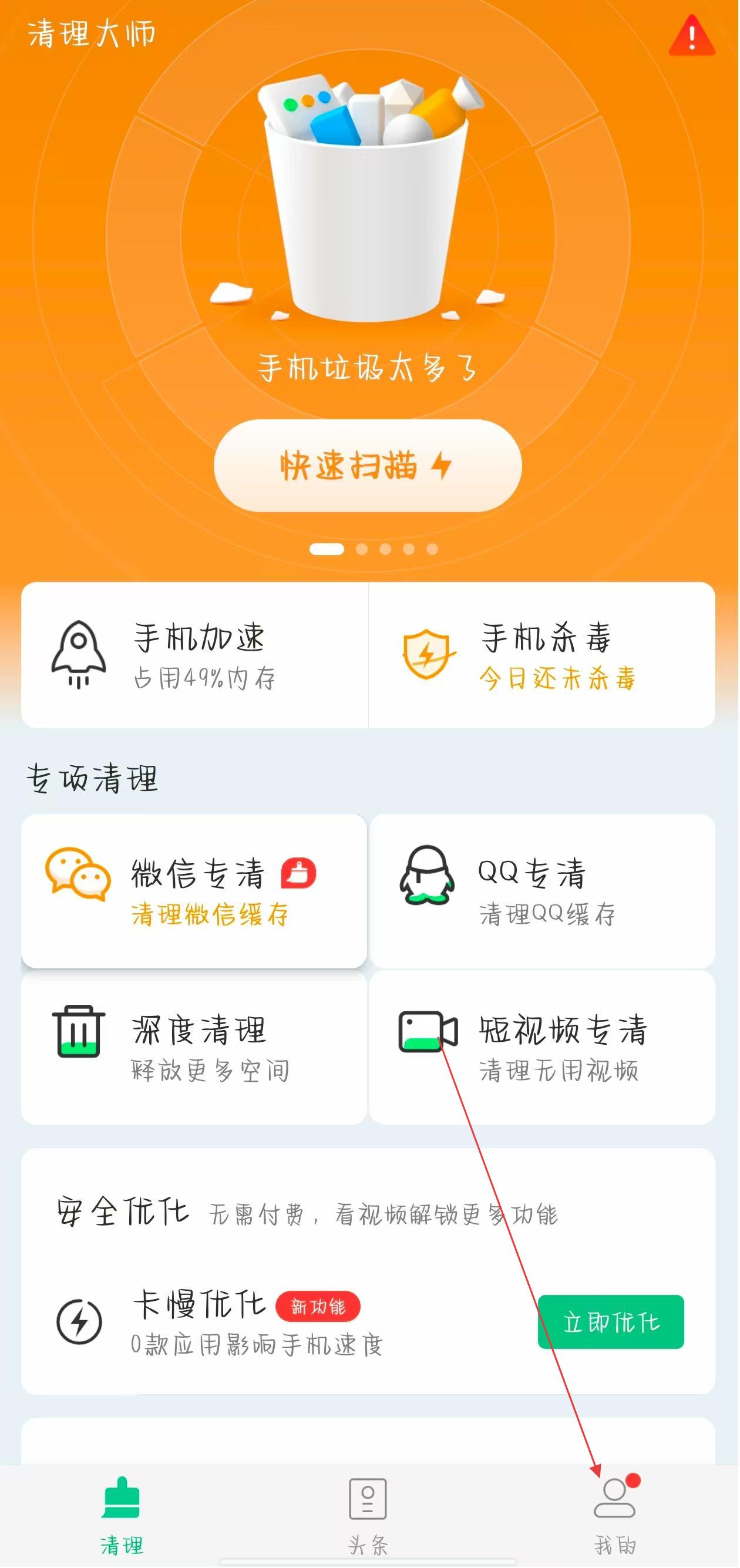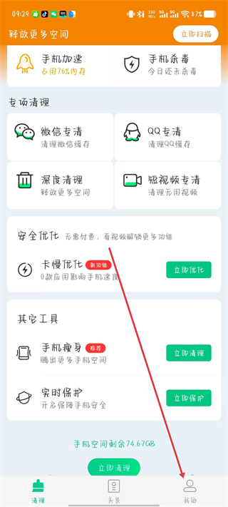 1、打開清理大師應用,在主界面點擊右下角我的選項,進入個人中心頁面。