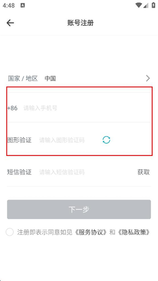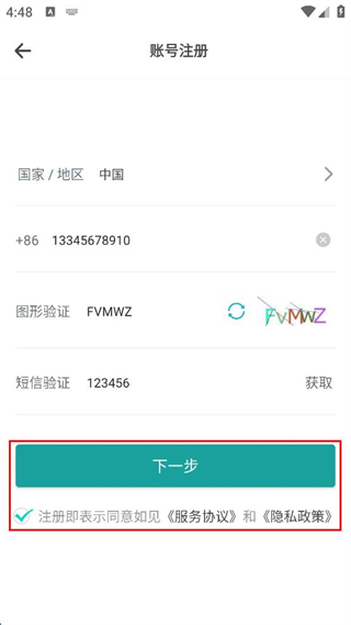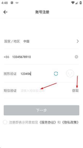 4、勾選注冊即表示同意如見服務協(xié)議和隱私政策,點擊下一步按鈕。