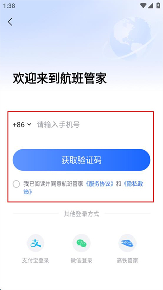 3、在登錄界面填寫手機(jī)號(hào)碼,勾選同意相關(guān)協(xié)議后點(diǎn)擊獲取驗(yàn)證碼。