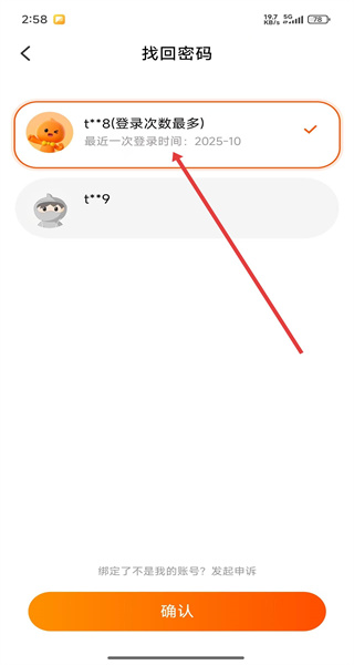 3、在賬號選擇頁面,選中需找回密碼的目標(biāo)賬號(如登錄記錄中的常用賬號),點(diǎn)擊“確認(rèn)”。