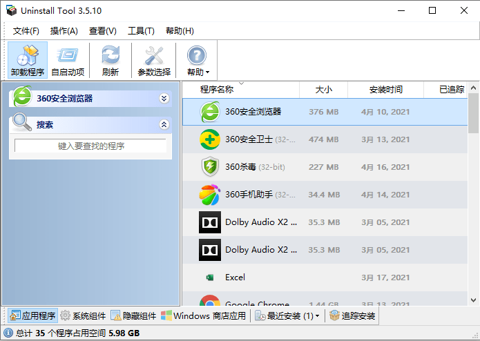 uninstall tool為綠色版免安裝,打開就可以使用,無需安裝教程和教程,也不需要密鑰、注冊碼。這是一個電腦強力卸載軟件,可以卸載系統(tǒng)工具,和其他軟件程序,并且刪的很干凈,減少電腦中的垃圾。
