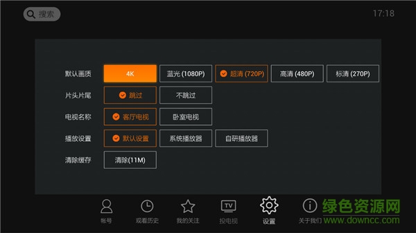 2.在云視聽(tīng)極光的“設(shè)置”中,可以對(duì)電視的畫(huà)質(zhì)進(jìn)行選擇。不僅能選擇超清視頻,還可以選擇藍(lán)光和4K畫(huà)質(zhì)。電視的片頭片尾也可以自由選擇跳過(guò)或者不跳過(guò)。還有電視名稱(chēng)、播放設(shè)置都可以根據(jù)用戶(hù)自己的需求進(jìn)行選擇。同時(shí)南極TV還自帶清除緩存功能,這樣以后看完電視清理一下,就不怕占用內(nèi)存了。
