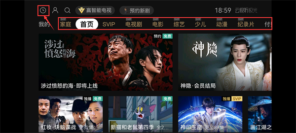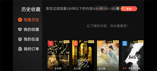 2、點(diǎn)擊首頁左上角的時(shí)鐘標(biāo)志,就能查看自己的觀看記錄、收藏記錄等詳細(xì)信息;