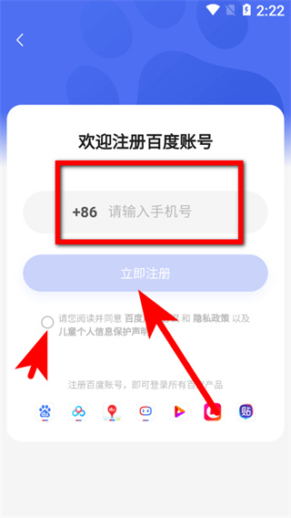 4、輸入手機(jī)號,勾選用戶協(xié)議后,點(diǎn)擊立即注冊按鈕,完成賬號注冊。