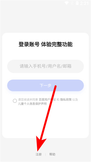 3、在登錄賬號頁面,點(diǎn)擊下方注冊選項,進(jìn)入百度賬號注冊頁面。