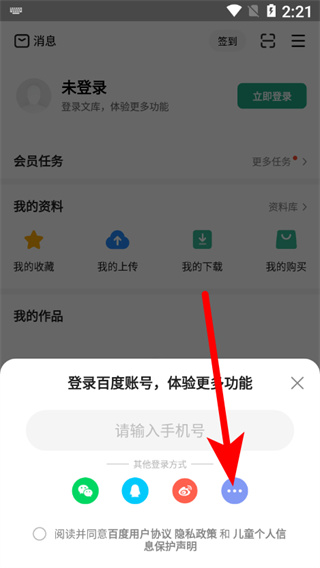 1、在百度文庫我的頁面,點(diǎn)擊立即登錄按鈕,彈出登錄方式選擇框。