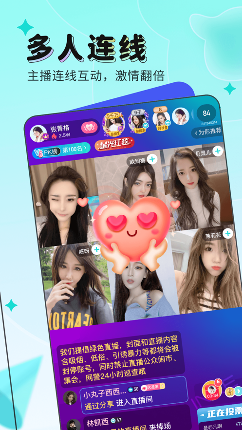 匯集千萬粉絲,超過1000個明星藝人,5000個網(wǎng)絡(luò)紅人,10000個大學生,10萬個帥哥和美女,來自全球的華人和留學生每天24小時不中斷視頻直播,與偶像面對面互動,你的ta從未如此真實,如此靠近你