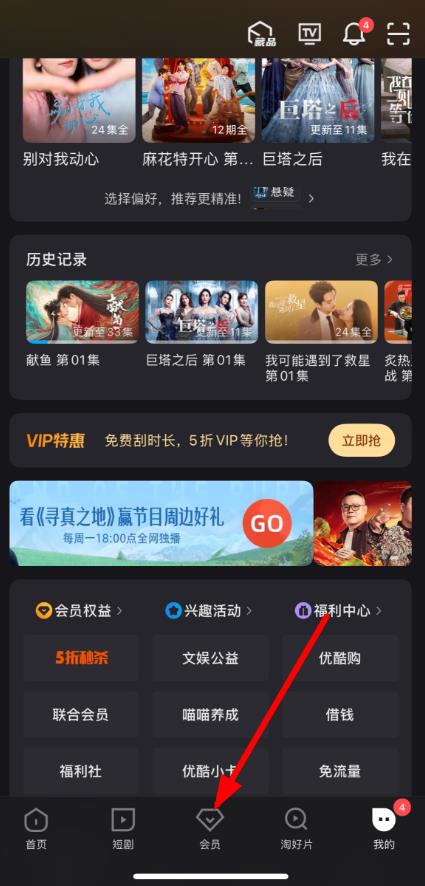 1、打開優(yōu)酷APP,點(diǎn)擊底部導(dǎo)航欄中的會(huì)員選項(xiàng)進(jìn)入會(huì)員界面。
