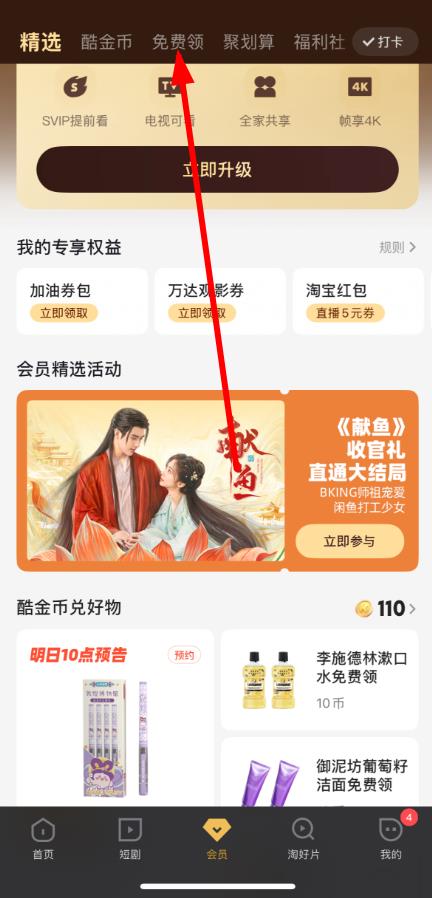 2、在會(huì)員界面上方的導(dǎo)航欄里,點(diǎn)擊免費(fèi)領(lǐng)選項(xiàng)。