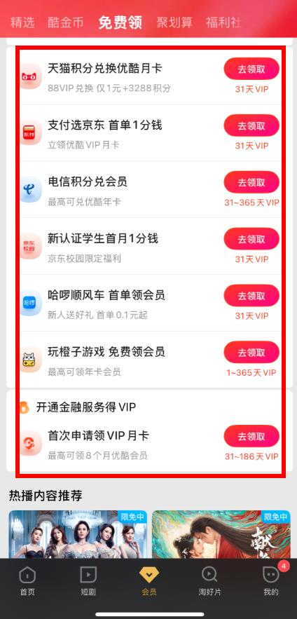 3、進(jìn)入免費(fèi)領(lǐng)界面后,查看下方列出的活動(dòng),點(diǎn)擊對(duì)應(yīng)活動(dòng)右側(cè)的去領(lǐng)取,按提示操作即可嘗試免費(fèi)領(lǐng)取優(yōu)酷會(huì)員。