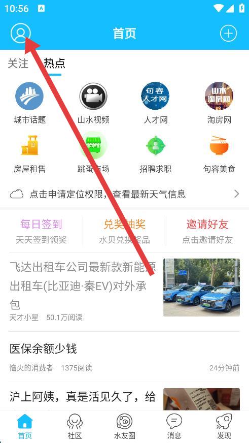 1、打開山水句容,點擊首頁左上角的頭像圖標。