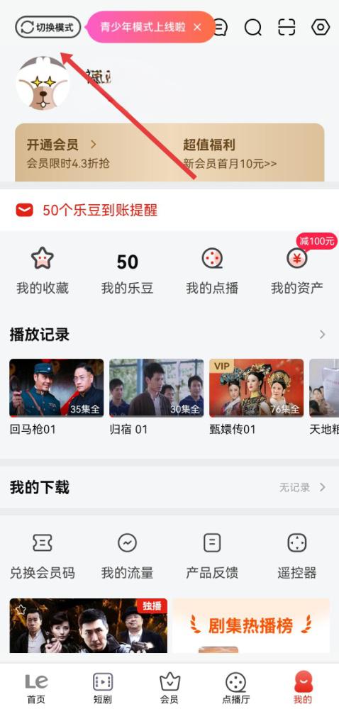 1、打開樂視視頻APP,點擊底部導(dǎo)航欄的我的,在個人中心頁面左上角,找到并點擊切換模式按鈕。